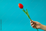 Hand holding tulip flower with red Easter egg instead of blossom on light blue background. Creative Easter concept. Surreal festive holiday layout. Spring background with copy space.