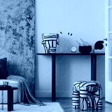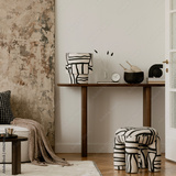 Stylish interior with abstract patterns, earthy tones, and sculptural furniture in a contemporary setting.
