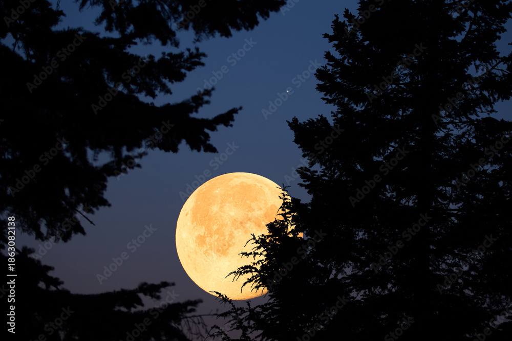 Full Moon with stars, planets and rural countryside tree silhouettes.