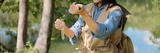 Woman environmental expert tests water sample tube outdoors in green rural field