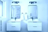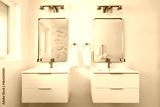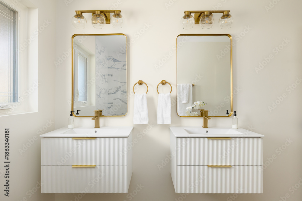 A bathroom detail with floating white fluted cabinets, gold faucets on white sinks, and gold lights mounted over mirrors.