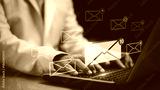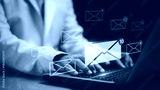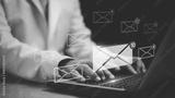 Business email communication concept. Businessman typing on laptop and virtual mail notification icons. Digital messaging, online inbox, customer support, marketing and modern office technology.