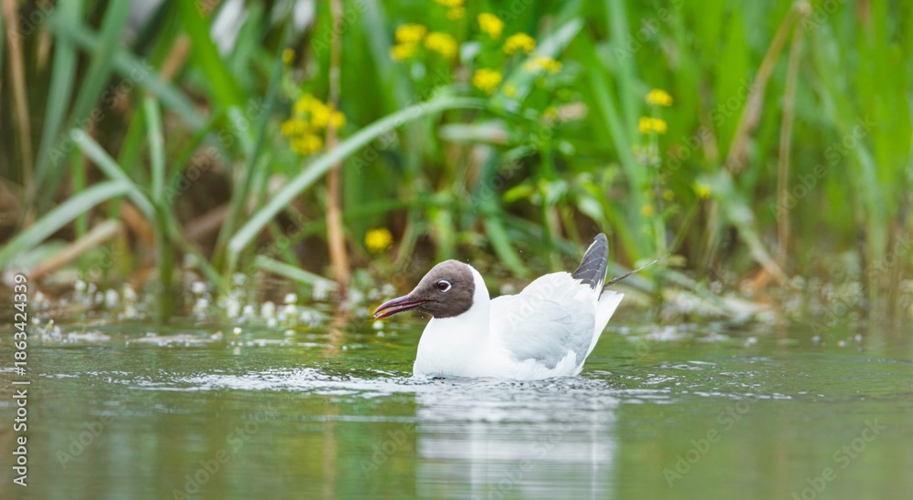 In the vibrant Delta Vacaresti, a seagull glides effortlessly across the shimmering water, surrounded by lush greenery and blooming flowers. Serenity reigns in this urban oasis