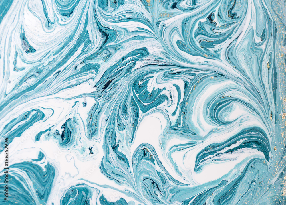 Marble abstract acrylic background. Blue marbling artwork texture. Golden glitter.