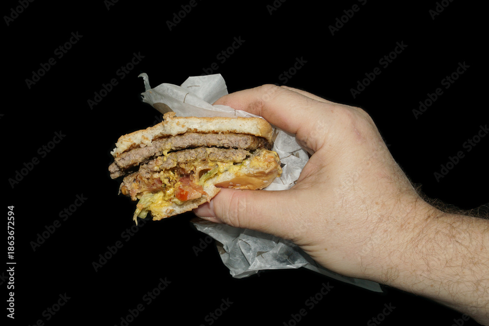 A man's hand holds a half-eaten, delicious hamburger on a black background. Isolate on black.