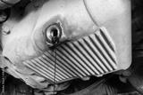 The process of draining used oil from the engine in a car service. Changing the oil in a car. Draining the oil to the last drop.