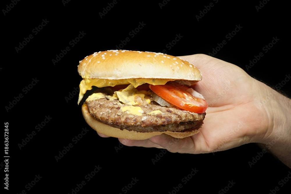 In a man's hand, a delicious burger on a black background. Isolate on black.