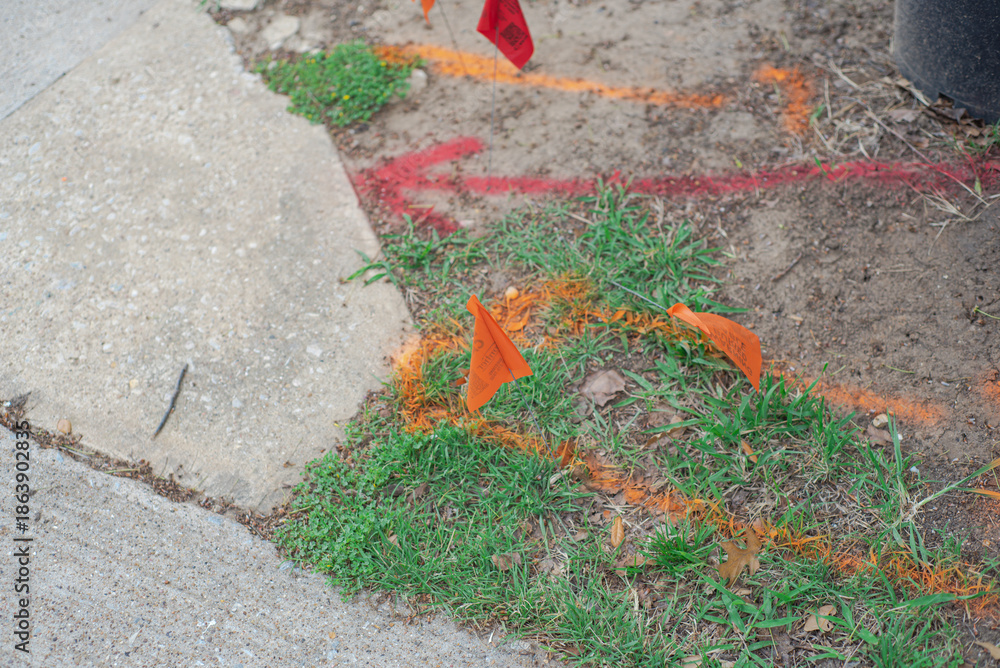 Marked ground area featuring red and orange utility flags and spray painted lines, documenting pre dig mapping procedures used to identify buried cables, ensure safe residential excavation, Texas