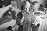 Caucasian middle aged woman talking on smartphone while holding thermometer, senior Caucasian man lying on couch in background, medical device and chessboard visible on table