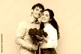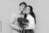 Happy European lady posing with her boyfriend and holding bouquet of red roses, celebrating Valentine's Day together over pink studio background