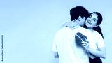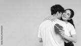 Happy couple in love celebrating Valentine's day, lady holding heart shaped gift box while embracing boyfriend, pink studio background