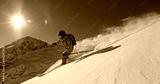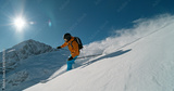 Skier riding in the scenic Dolomites mountains in fresh po . Super slow motion at 1000 fps.