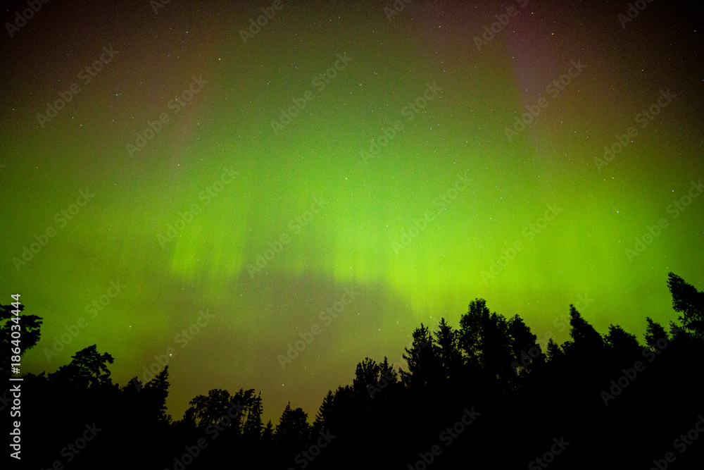 Strong northern lights over forest. Geomagnetic storm and night landscape.