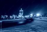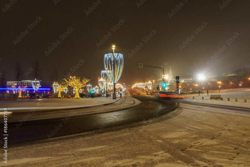 Christmas decoration of Moscow city, Russia, with car light trails, the Kremlin on background. Moscow journey to Christmas holiday.
