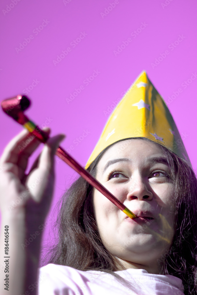 Attractive young women wearing party hat cheering and celebrating blowing party horn. Funny lovely girl blowing in party whistle and copy space over pink background. New year and celebrate concept.