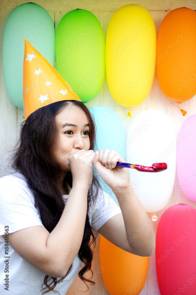Happy women wearing party hat cheering and celebrating blowing party horn. Funny lovely girl blowing in party whistle and copy space over colorful balloon background. New year and celebrate concept.