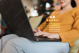 Online customer review analytics, Customer review rating concept with score and trust indicators displayed over woman using laptop. rating and feedback. trust visualization, e commerce.