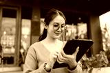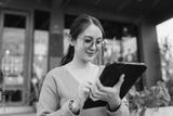 Confident Asian businesswoman holding tablet, focused on digital workflow. Authentic commercial lifestyle visual for small business management. SME solutions, women in business campaigns.