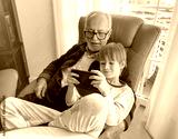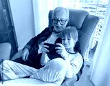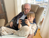 Grandfather enjoys watching his young grandson, looking at the phone together, sitting in the armchair at home.