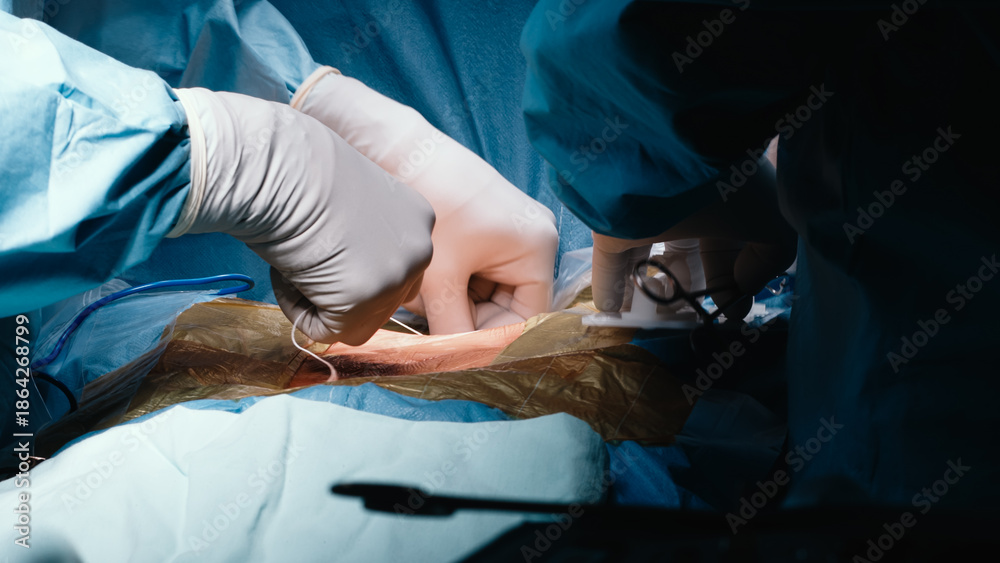 Surgical team performing intricate procedure in operating room, showcasing precision and teamwork with sterile instruments and blue drapes, emphasizing medical expertise and care