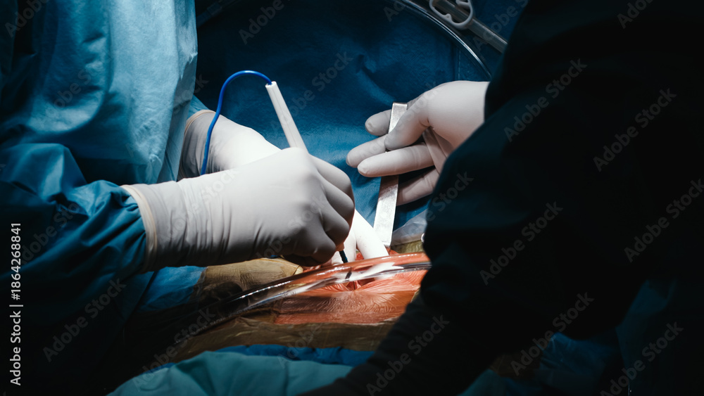 Surgical team performing intricate procedure in operating room, focused on patient care with sterile instruments and bright lighting, showcasing precision and teamwork in healthcare