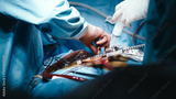 Surgical team member in blue scrubs skillfully operates with surgical instruments in an operating room, showcasing precision and focus during a critical procedure