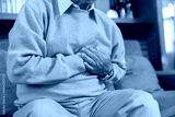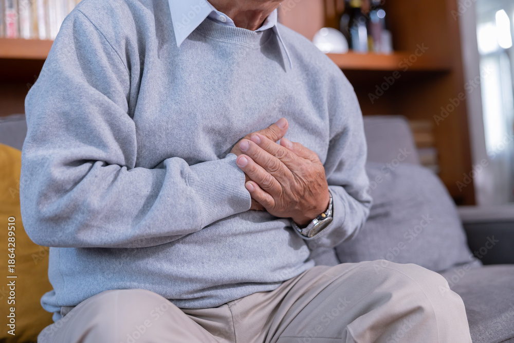 Elderly man grab his chest with hand suffer from chest pain in a living room