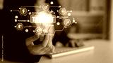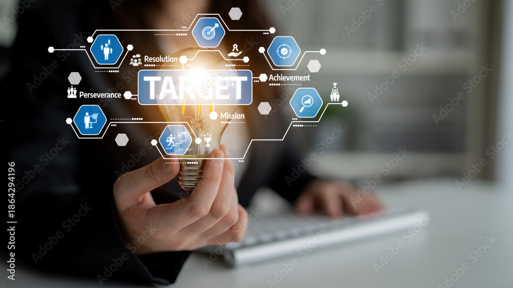 A business professional holding a light bulb represents innovation and ideas while targets and achievements are visualized in a modern office setting. Tessel