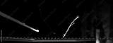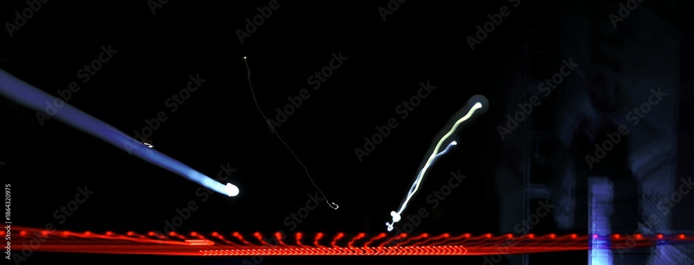 Linear composition. Аbstract long-exposure photograph depicting colorful neon light trails against a dark background.