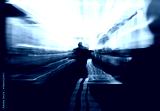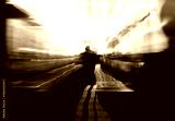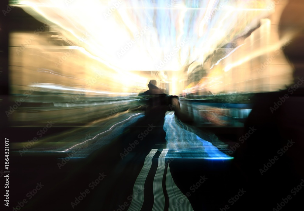 Abstract background. Long-exposure photograph depicting colorful neon light trails against a dark background. Linear composition. Textured colorful spots with selective focus.