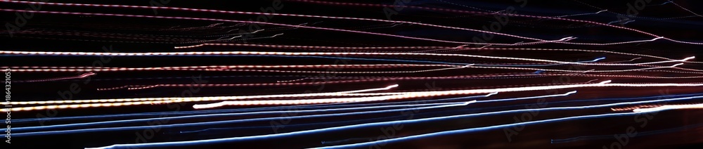 Linear composition. Аbstract long-exposure photograph depicting colorful neon light trails against a dark background.