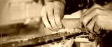 Ski maintenance and repair. Closeup of service worker scraping dry wax off ski base. copy space