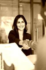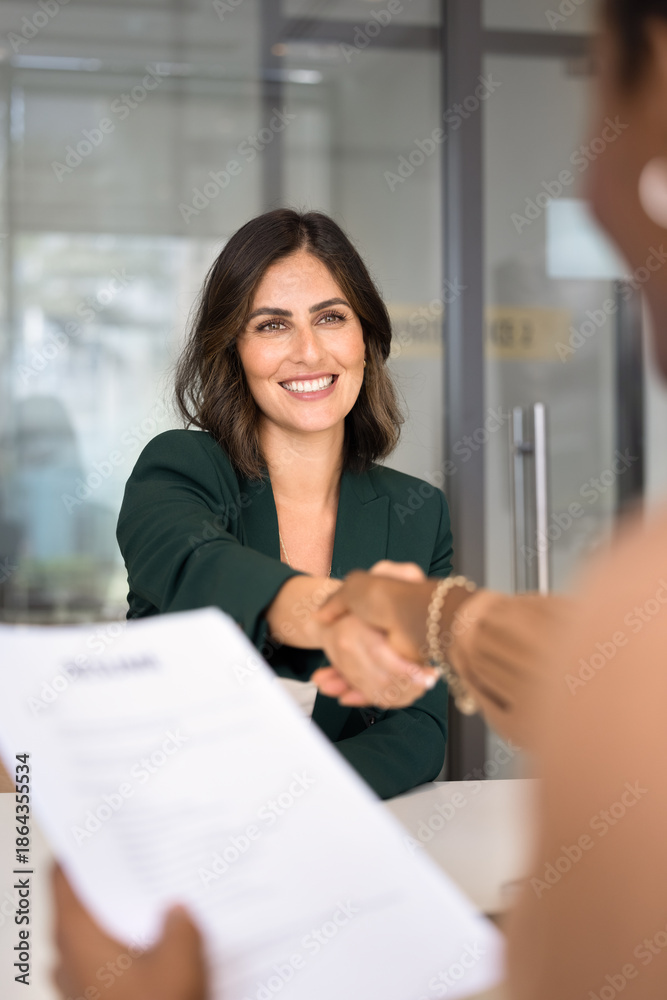 Happy young Latin vacancy candidate getting job, shaking hands with recruit manager holding paper resume. HR professional welcoming new employee onboard. Vertical shot