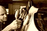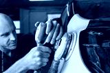 Grinder in the hands of a man who sharpen a car varnish in the car shop.