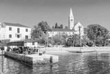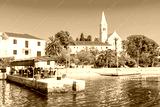 SUMARTIN PORT, BRAC ISLAND - SEP 13, 2017: people dining in restaurant in Sumartin port with beautiful church in background, Brac island, Croatia.