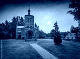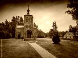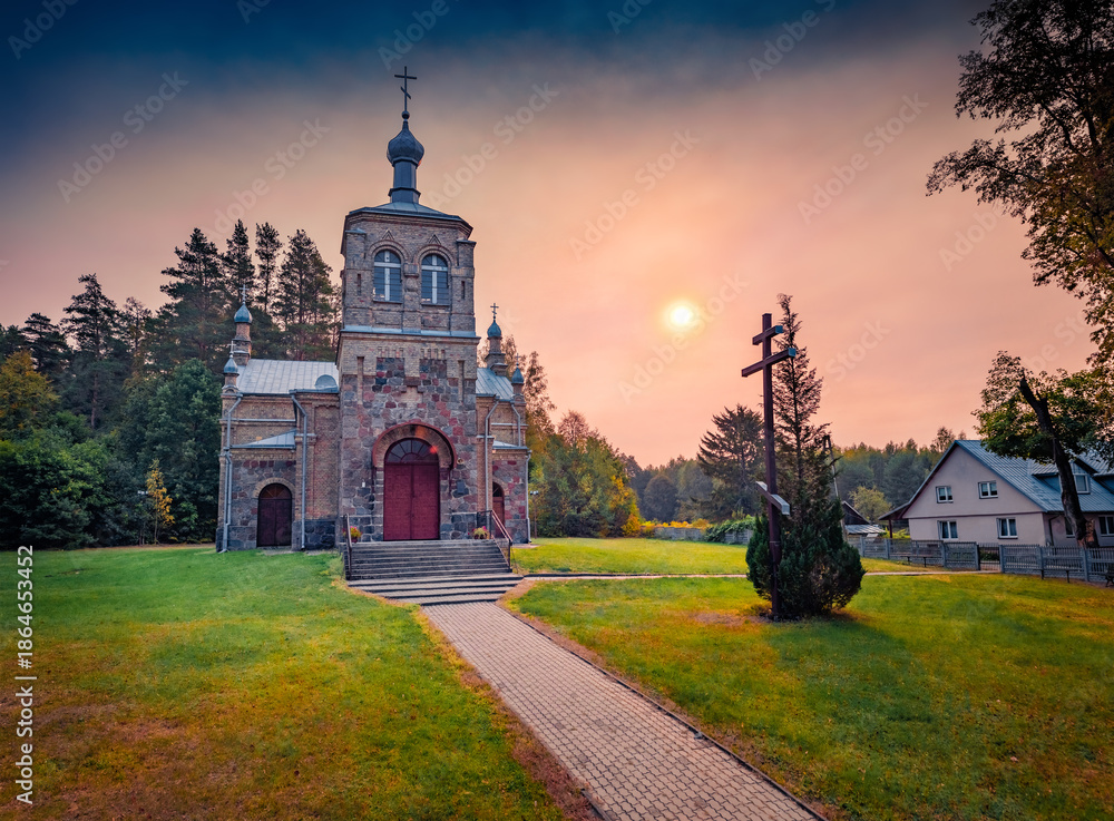 Misty morning view of stone Orthodox Church of St. Anne. Stunning summer cityscape of Krolowy Most village, Poland, Europe. Traveling concept background.