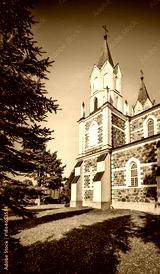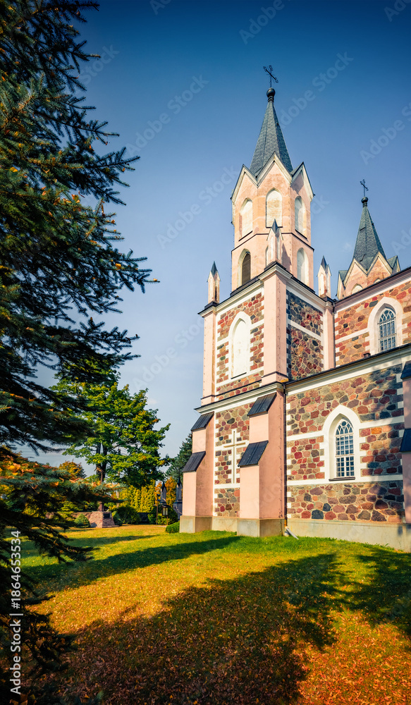 Nice autumn view of Catholic Church of the Assumption of the Blessed Virgin Mary. Beautiful morning cityscape of Punsk village in the Podlaskie Voivodeship, Poland. Traveling concept background.