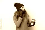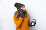 Teenager Russian girl wearing winter jacket isolated on white background holding coffee to take away and a mobile