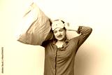 Teenager Russian girl isolated on white background in pajamas and holding a pillow stressed overwhelmed
