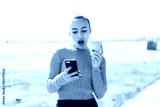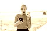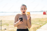 Young moroccan girl at outdoors using mobile phone and holding a coffee with surprised expression