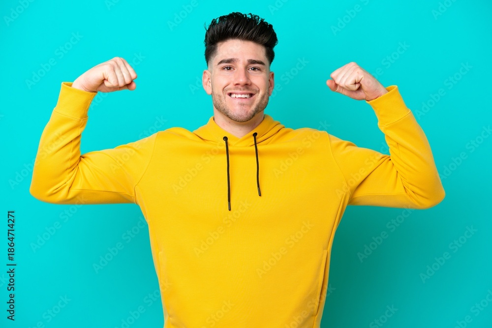 Young caucasian man isolated on blue background doing strong gesture