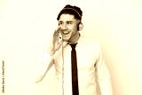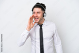 Telemarketer caucasian man isolated on white background shouting with mouth wide open to the side