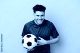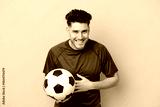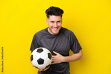 Handsome young football player man isolated on yellow background smiling a lot
