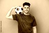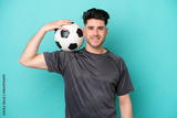 Young caucasian man isolated on blue background with soccer ball