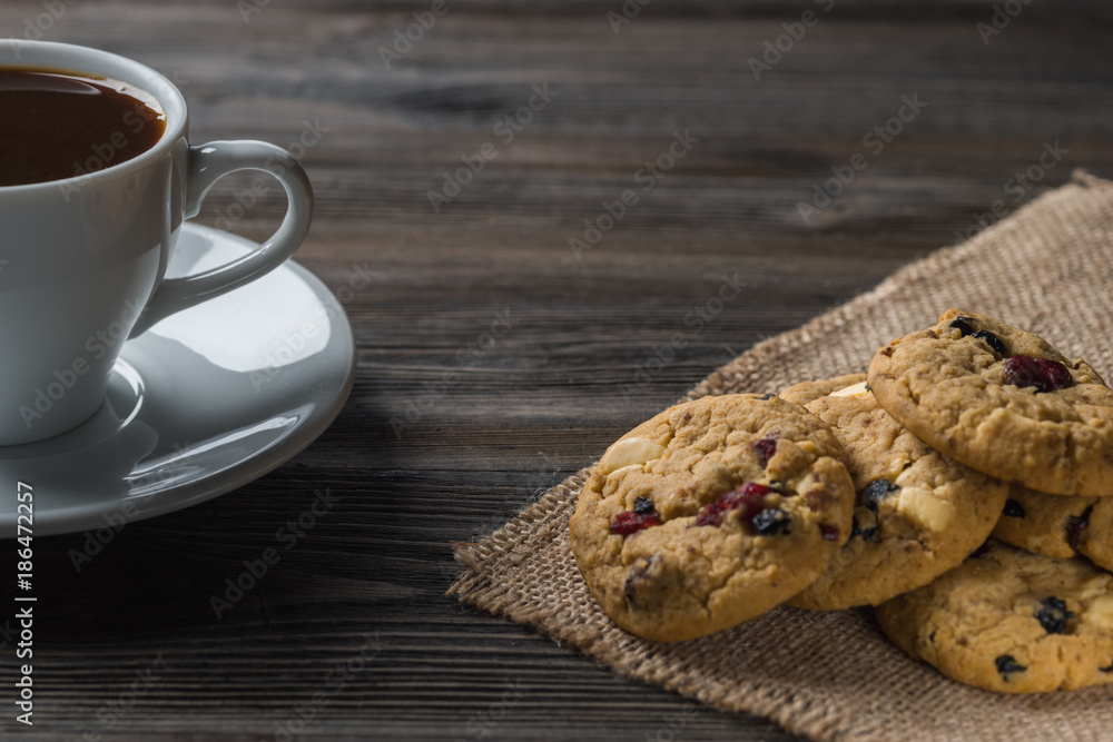 Coffee cup and cookies composition on rustic wooden background