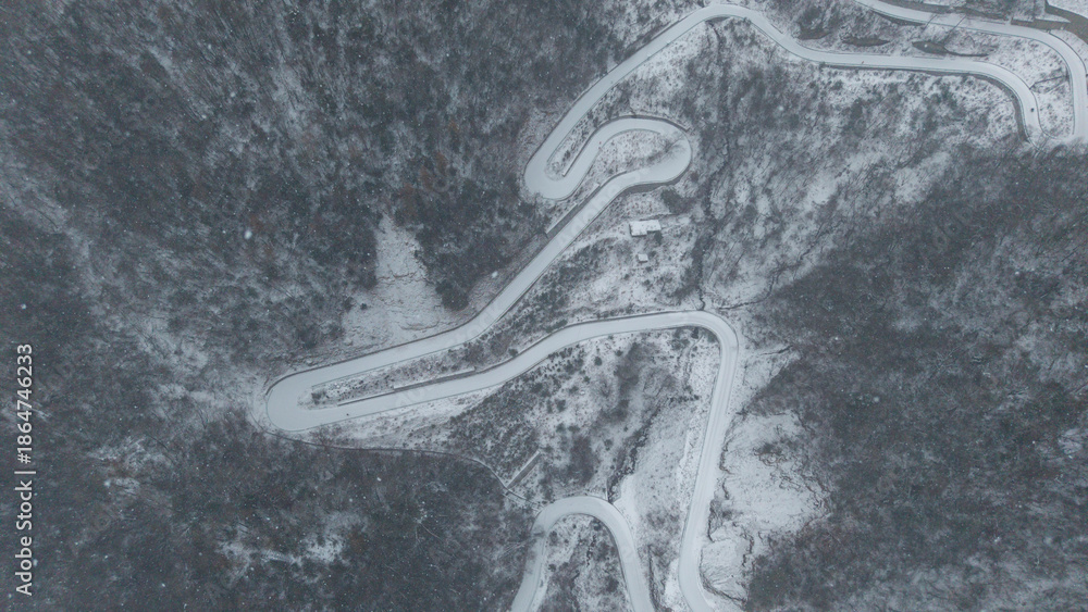 The winding mountain road covered in heavy snow