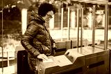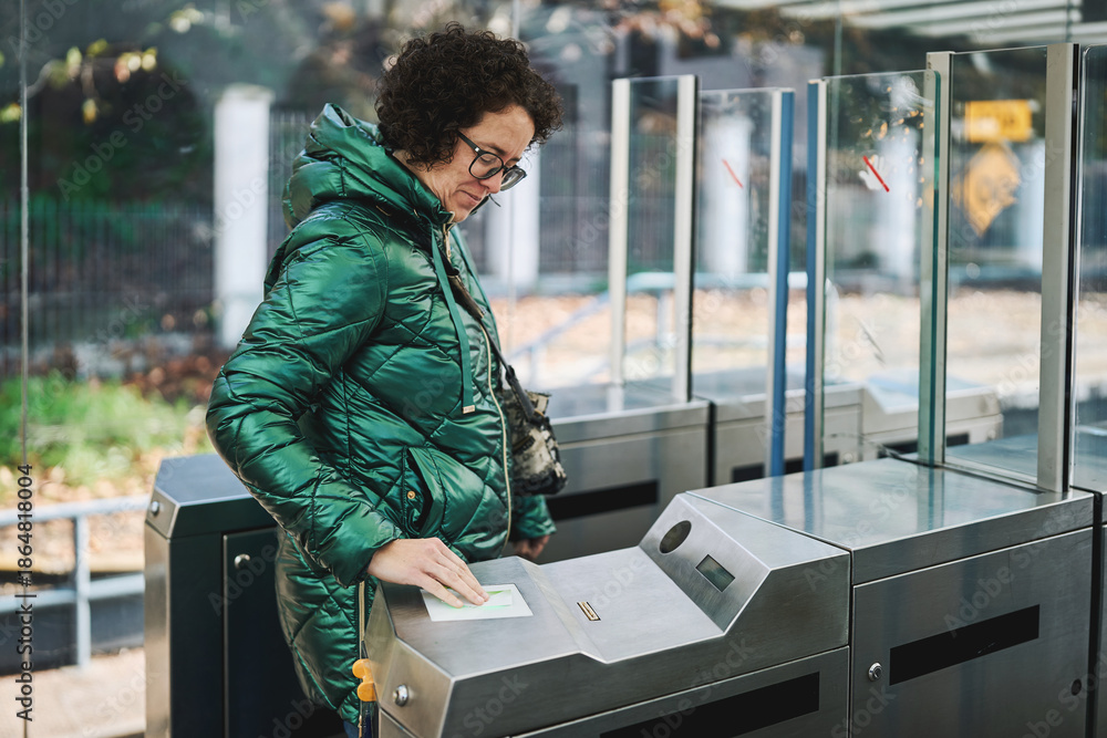 Woman scanning transit card at electronic turnstile outdoors