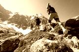 Three trail runners, two men and a woman, running up a steep trail in the mountains in the Alps on a hot, bright summer day.