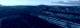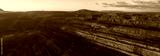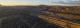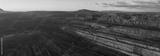 High resolution panoramic view of an open pit coal mine with mining machines, layered terrain. Industrial landscape showing large scale extraction, energy production, and environmental impact.