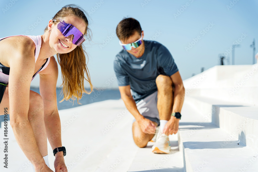 Couple prepares for fitness activity on outdoor steps